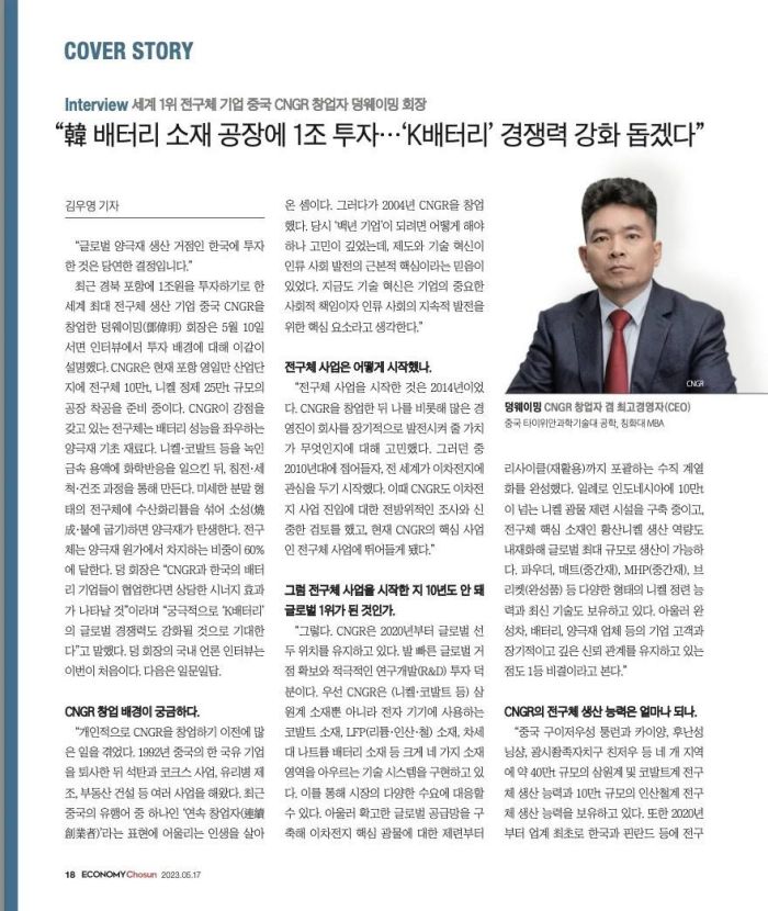 近日,韩国权威经济周刊《Economy Chosun(经济朝鲜)》专访中伟股份董事长邓伟明,并以“封面故事”刊发在第492期以“电池之战”为主题的周刊中。