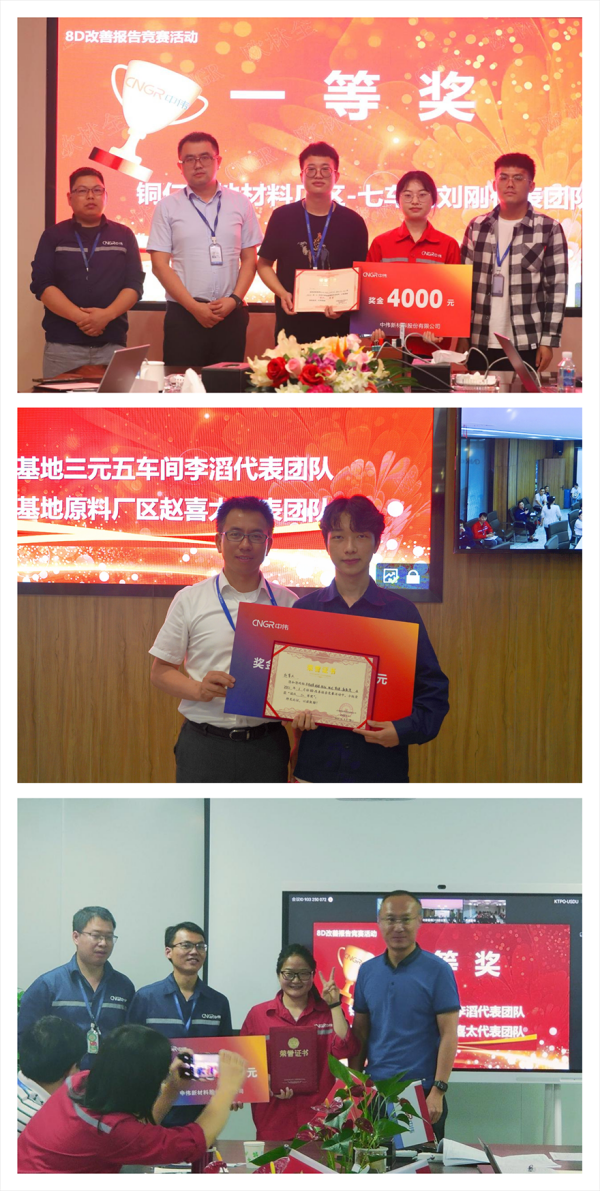通过4个小时的激烈竞争,以及评委老师们的专业点评和公正打分,最终,来自铜仁产业基地材料厂区七车间刘刚团队以缜密的逻辑、精彩的演讲和应用改善效果摘得桂冠,钦州产业基地三元五车间李滔团队和宁乡产业基地原料厂区赵喜太团队并列第二,宁乡产业基地三元一车间王小能团队、四钴一车间姜建明团队,铜仁产业基地材料厂区三车间樊正旺团队、材料厂区设备部胡波团队获得并列第三。
