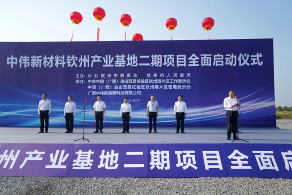 杨斌代表钦州市委、市人民政府向中伟钦州产业基地二期项目全面启动表示热烈祝贺。中伟钦州产业基地是广西打造新能源新材料产业集群的核心项目,基地二期项目的全面启动,将对广西抢占新一轮产业发展新高地、打造千亿级新能源材料产业集群,延伸发展新能源汽车、储能、新基建等新兴产业具有重要意义。