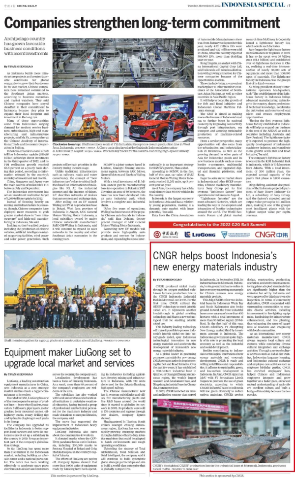 作为国家英文日报,中国日报(China Daily)在11月15日当天发行的G20特刊中,聚焦中伟在印尼的产业发展,用四分之一版面大幅刊登题为《CNGR helps boost Indonesia's new energy materials industry》(中伟助力印尼新能源材料产业发展)的重点报道。
